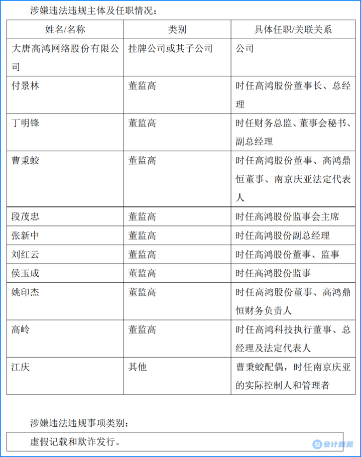 在涉案期间,付景林任高鸿股份董事长、总经理等职务,丁明锋任财务总监、董事会秘书、副总经理等职务,二人未勤勉尽责,是高鸿股份上述违法行为直接负责的主管人员。曹秉蛟任高鸿股份董事、高鸿鼎恒董事、南京庆亚法定代表人,段茂忠任高鸿股份监事会主席,张新中任高鸿股份副总经理,刘红云任高鸿股份董事、监事,侯玉成任高鸿股份监事,姚印杰任高鸿股份董事、高鸿鼎恒财务负责人等职务,上述人员未勤勉尽责,是其他直接责任人员。